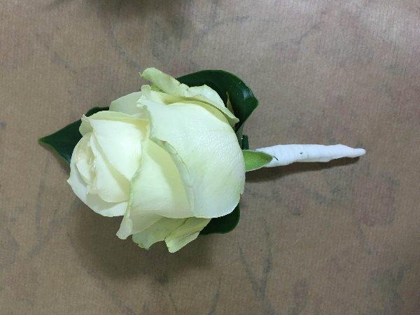 valkoinen ruusu lehden päällä rintaneulaan kiinnitettynä